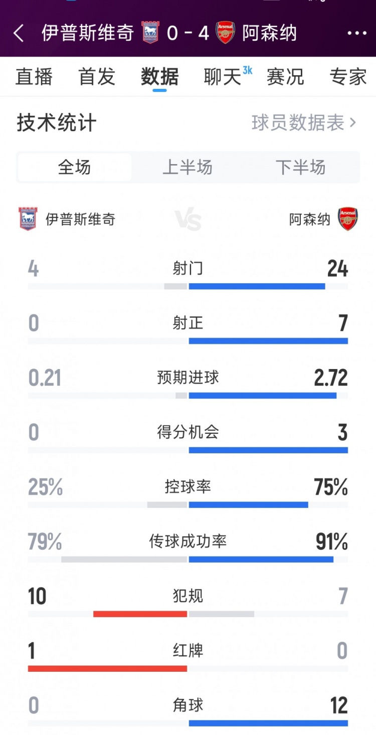 4月20日宣 在本轮英超,阿森纳4-0大胜伊普斯维奇,以下为双方全场数据对比: