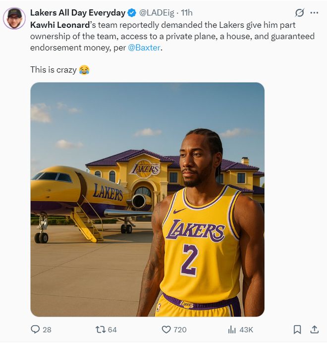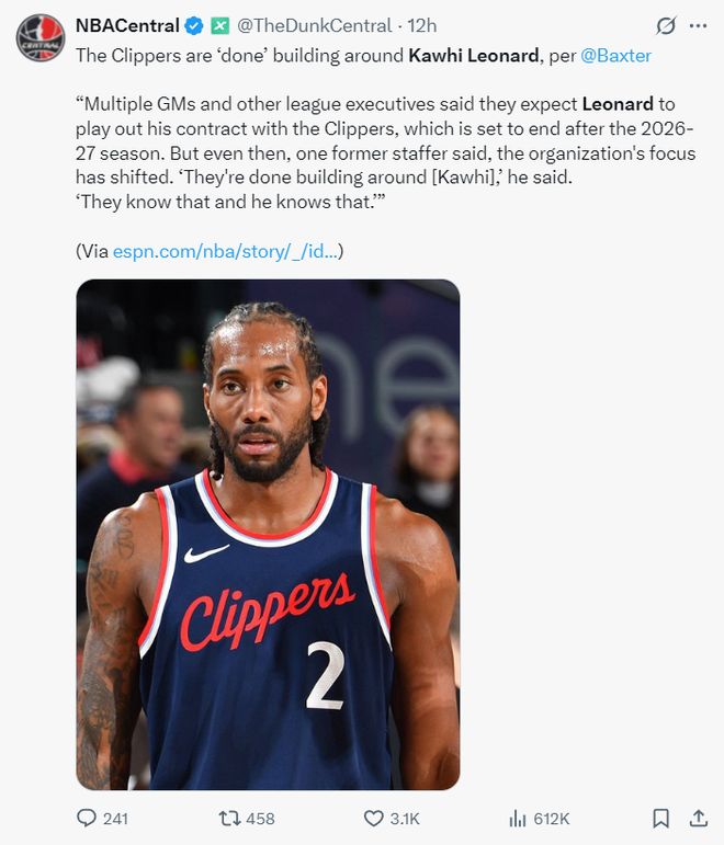 NBA记者Baxter则表示,多位联盟的高管与其他职业体育联盟的经理人都觉得科怀-伦纳德会跟快船执行完合同,他的合同在26-27赛季结束后到期。