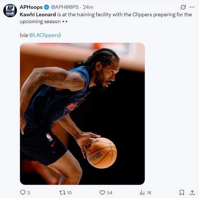 6小时后,根据美媒APHoops的报道,快船方面的消息,科怀-伦纳德正在快船的训练基地训练以备战即将到来的新赛季。【换言之小卡还是在快船】