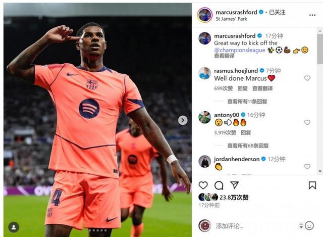 此役拉什福德为巴萨梅开二度,赛后他在社交媒体上晒出庆祝进球的照片,配文:“开启欧冠征程的绝佳方式。”
