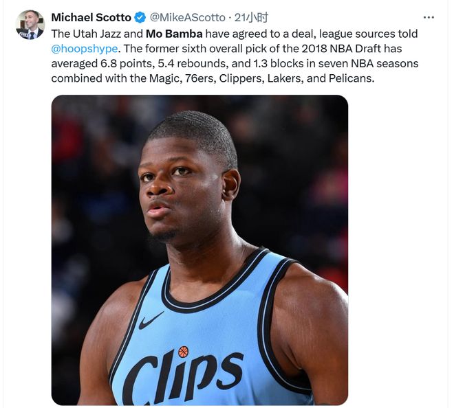 PS:爵士队目前阵容中有 20 名球员(除了其他 15 名球员外,还有两名 Exhibit 10 合同球员和三名双向合同球员)签下班巴将使他们达到 21 人达到上限