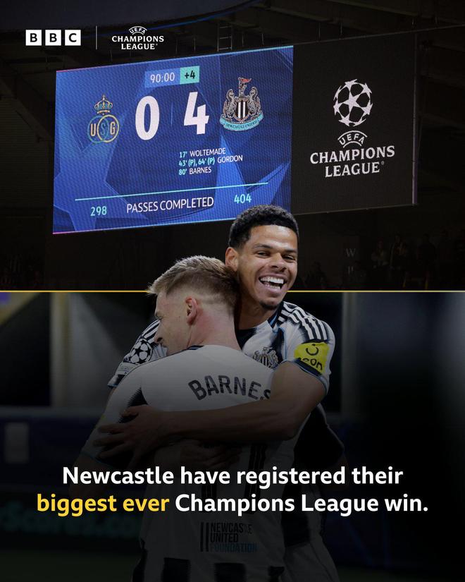据统计,这是纽卡斯尔联队史在欧冠赛事中取得的最大比分差距的胜利。