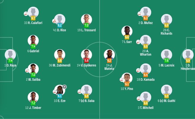水晶宫首发:1-亨德森、2-穆尼奥斯(92'24-索萨)、26-理查兹、5-拉克鲁瓦、6-格伊、3-米切尔(92'12-乌切)、20-沃顿(92'8-莱尔马)、18-镰田大地(74'19-休斯)、7-萨尔、10-皮诺(59'9-恩凯蒂亚)、14-马特塔