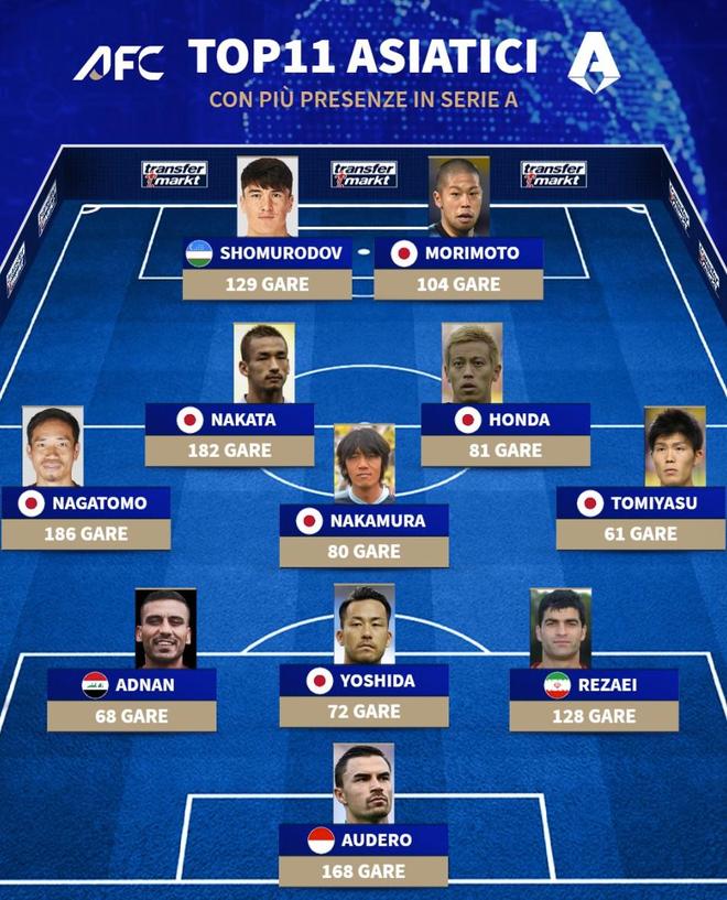 北京时间12月13日,德转列出了意甲联赛历史出场次数最多的亚洲球员11人阵容,长友佑都、中田英寿领衔,本田圭佑、中村俊辅、吉田麻也以及富安健洋在列。