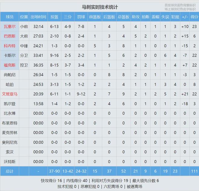 马刺四人得分20+:瓦塞尔23分5板4助、文班亚马22分9板2助2帽、福克斯22分2板4助2断、卡斯尔22分6板2助。亚历山大空砍29分4板5助。决赛时间是12月17日上午9点半,马刺vs尼克斯!最后看看比赛数据,说说你的心情: