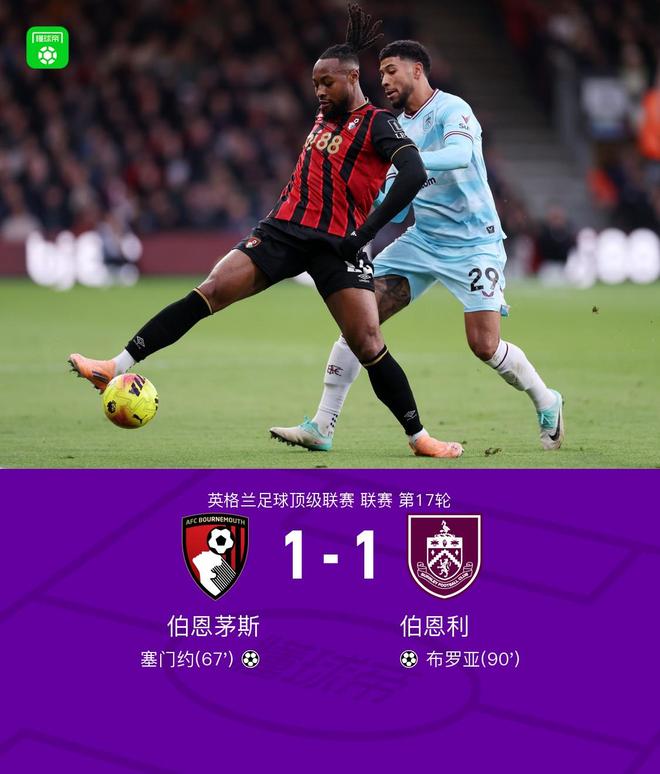 北京时间12月20日,英格兰足球超级联赛第17轮,伯恩茅斯主场迎战伯恩利。比赛中,塞门约为伯恩茅斯打破僵局,取得领先。第90分钟,爱德华兹传中,布罗亚头球破门帮助伯恩利扳平比分。最终双方以1-1握手言和。