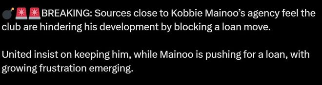据报道,曼联目前对梅诺的情况越发感到不满,主要原因在于他和经纪人的缺乏耐心。曼联一直相信他很有前途,遗憾的是,梅诺的团队先是索取高薪,随后在失去主力位置时只想着走人,而没有积极改变自己,而是觉得阿莫林阻碍了他的发展。