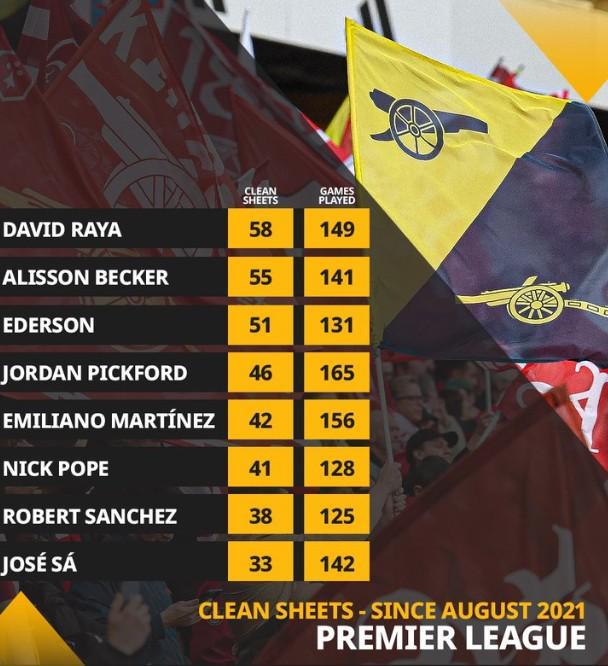 据统计,拉亚于2021年8月完成英超首秀,这名西班牙门将在149场联赛中完成58次零封,这是英超门将同期最佳成绩。