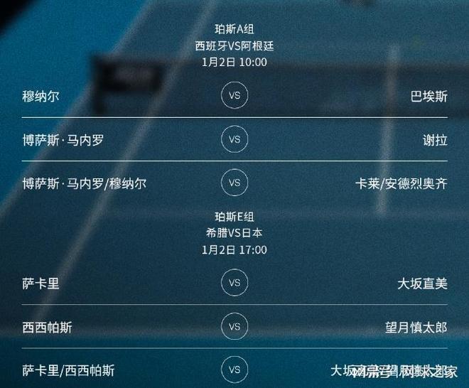 北京时间今天上午10点,联合杯(UnitedCup)网球混合团体赛在澳大利亚的珀斯率先开打。首个比赛日,A组的西班牙队对阵阿根廷队,E组的希腊队与日本队展开较量。在已经公布的出战球员名单中,A组的西班牙队派出了穆纳尔和马内罗两人出场,阿根廷队则是由巴埃斯、谢拉和另一对混双组合迎战。具体对阵如下:穆纳尔 vs 巴埃斯、马内罗 vs 谢拉、马内罗/穆纳尔 vs 卡莱/安德烈奥齐。E组的希腊队由一哥西西帕斯和一姐萨卡里领衔出战,日本队则是由大坂直美和望月慎太郎出战。具体对阵:萨卡里 vs 大坂直美、西西帕斯 vs 望月慎太郎、萨卡里/西西帕斯 vs 大坂直美/望月慎太郎。